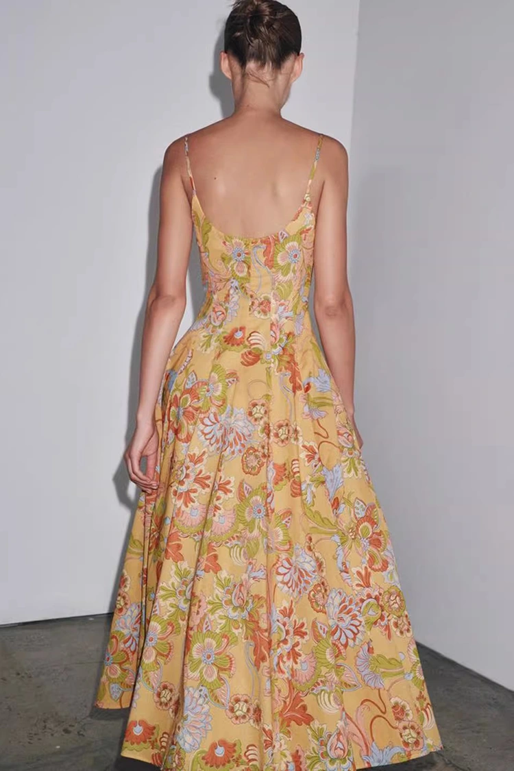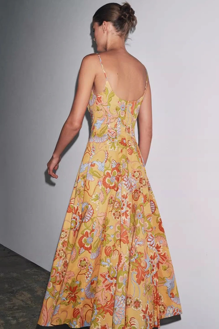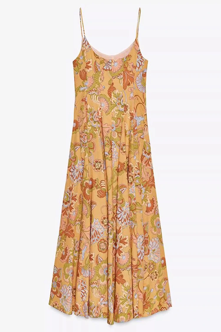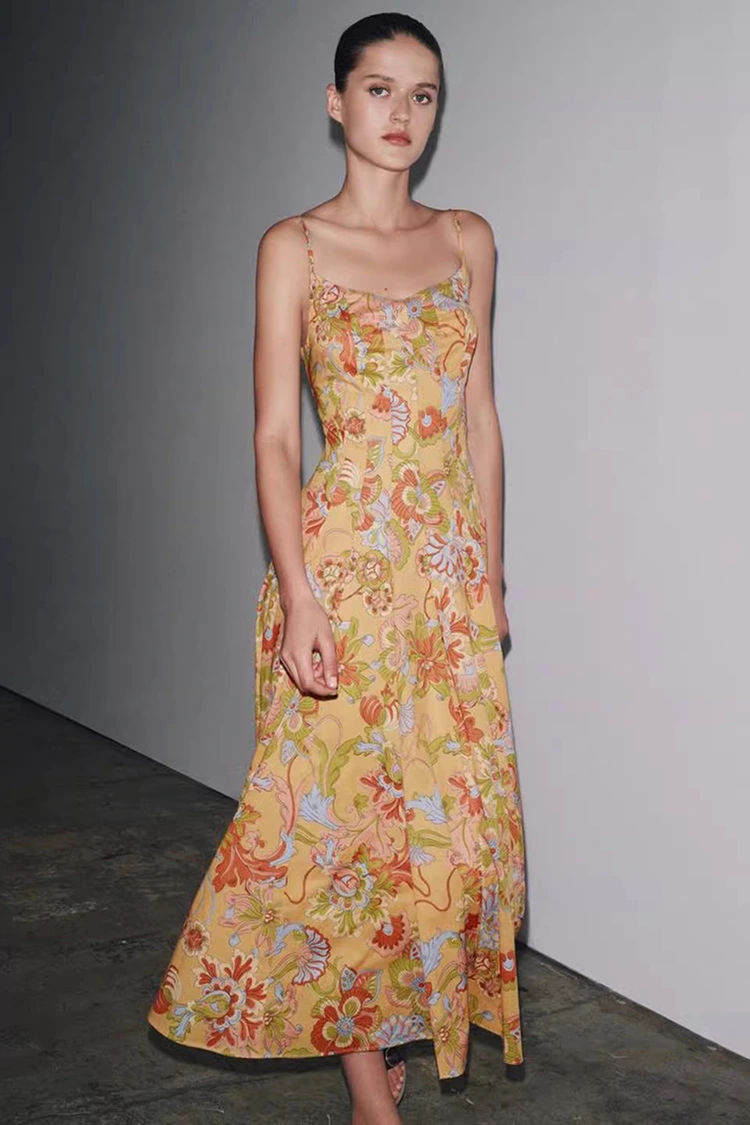 El vestido de algodón con estampado floral de verano para mujer tiene un color base naranja claro, con estampados florales de rica textura que cubren toda la superficie. Los tonos cálidos y suaves aportan vitalidad, como si todo un floreciente jardín de verano se llevara sobre el cuerpo. Combina un ambiente retro romántico con un ambiente relajado de verano. La silueta presenta un diseño sin mangas y con cuello colgante, con líneas limpias y refrescantes, que pueden revelar hábilmente las líneas de los hombros y el cuello, dar forma a la figura proporcionalmente y al mismo tiempo liberarse de las limitaciones de las mangas cortas, satisfaciendo las necesidades de vestimenta del caluroso verano. El dobladillo de la falda es suelto y moderado, no exigente con la forma del cuerpo y puede ocultar fácilmente los pequeños defectos en la cintura, el abdomen y las piernas, siendo muy amigable para mujeres de todo tipo de cuerpo. La combinación perfecta de estampado retro y silueta elegante permite que este vestido no solo muestre el encanto femenino de la mujer, sino que también mantenga un estilo casual y relajado, rompiendo las limitaciones de un solo atuendo y adaptándose a varios estilos para la creación.