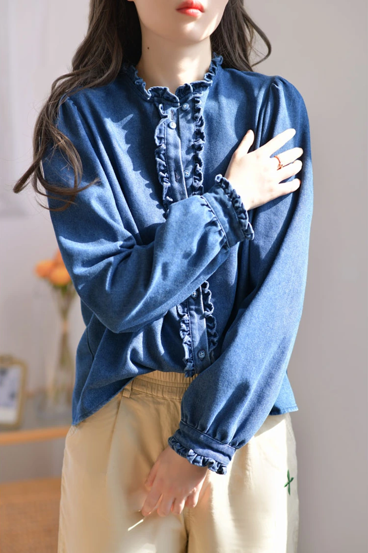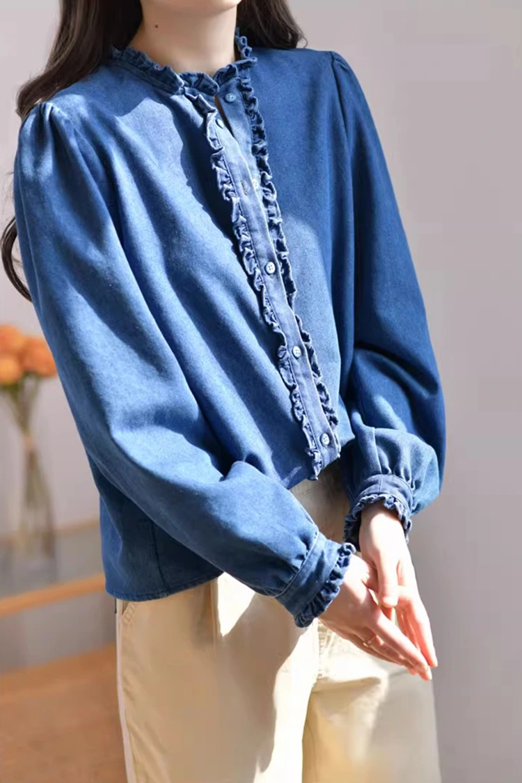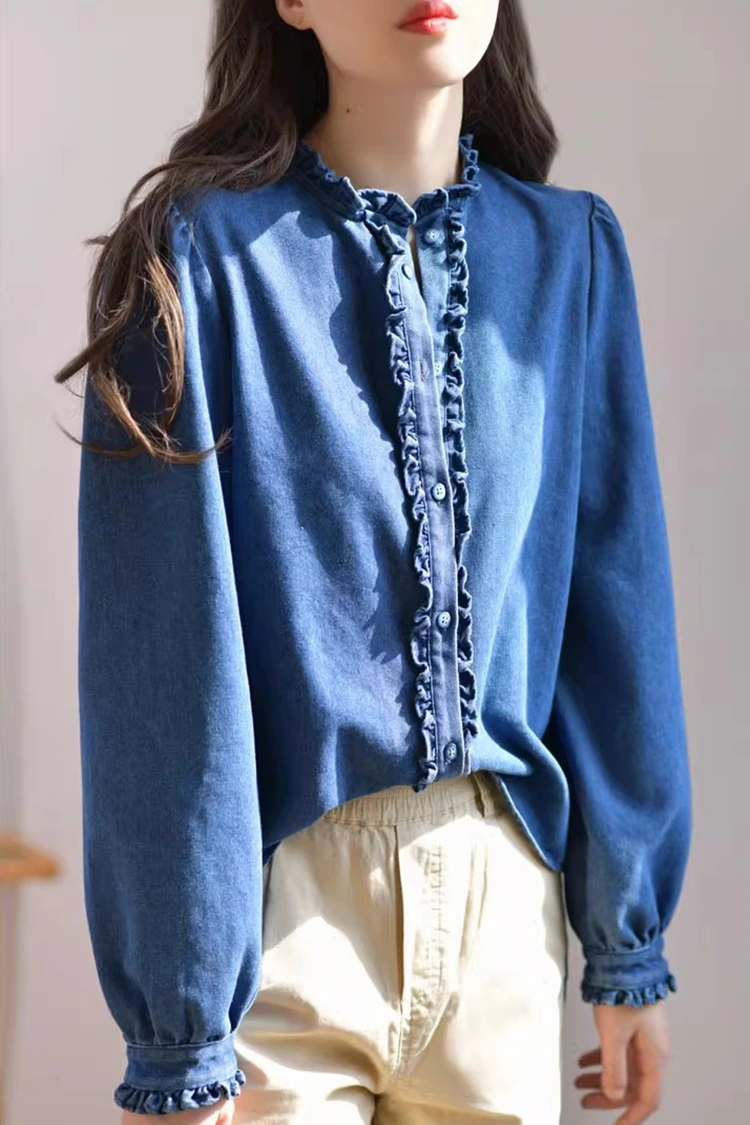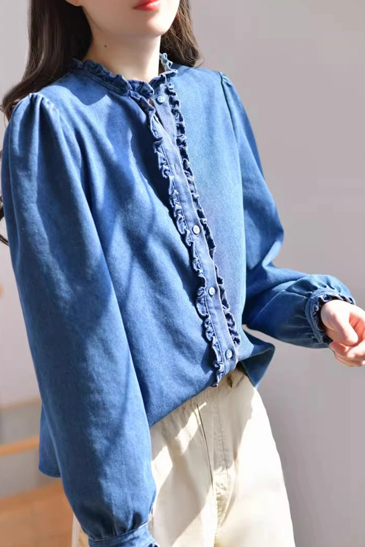 La blusa casual de mezclilla para mujer adopta un diseño de patrón retro e informal, que se adapta con precisión a la forma del cuerpo de las mujeres. No depende del tipo de cuerpo y no sólo puede refinar las líneas de los hombros y el cuello sino también ocultar el exceso de grasa en la cintura y el abdomen. Satisface las necesidades de diferentes tipos de cuerpo. El cuello está diseñado como un cuello alto, combinado con exquisitos bordes con volantes. La abertura delantera y los puños también están decorados con delicados bordes de volantes. Combinado con las mangas largas mullidas y en forma de farol, combina a la perfección la elegancia retro y la facilidad informal. El patrón simple de color sólido es clásico y duradero, y no pasará de moda. Puede crear un look informal diario o un estilo de negocios sencillo y es muy práctico.