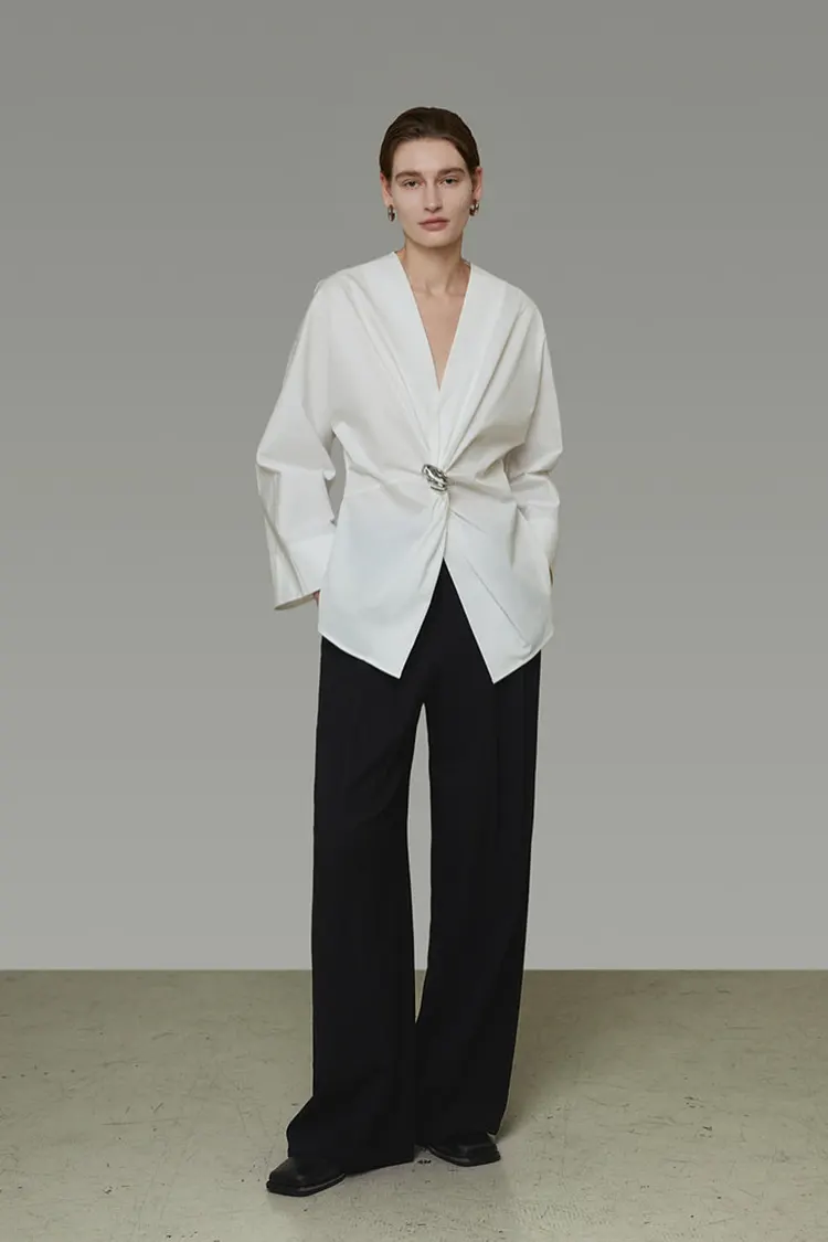 La blusa de fiesta con hebilla metálica para mujer presenta un nudo asimétrico en la cintura combinado con botones metálicos tridimensionales para decoración. El enfoque visual es prominente, ceñindo naturalmente la cintura y resaltando las curvas. También utiliza pliegues para suavizar la figura, ofreciendo un alto grado de flexibilidad para varios tipos de cuerpo. El cuello en V cruzado es limpio y elegante, con un tejido fresco y suave que es liviano y no se colapsa. Combina la practicidad de una camisa para el uso diario con el atractivo moderno de un top de fiesta, lo que permite un uso versátil y un fuerte reconocimiento visual.